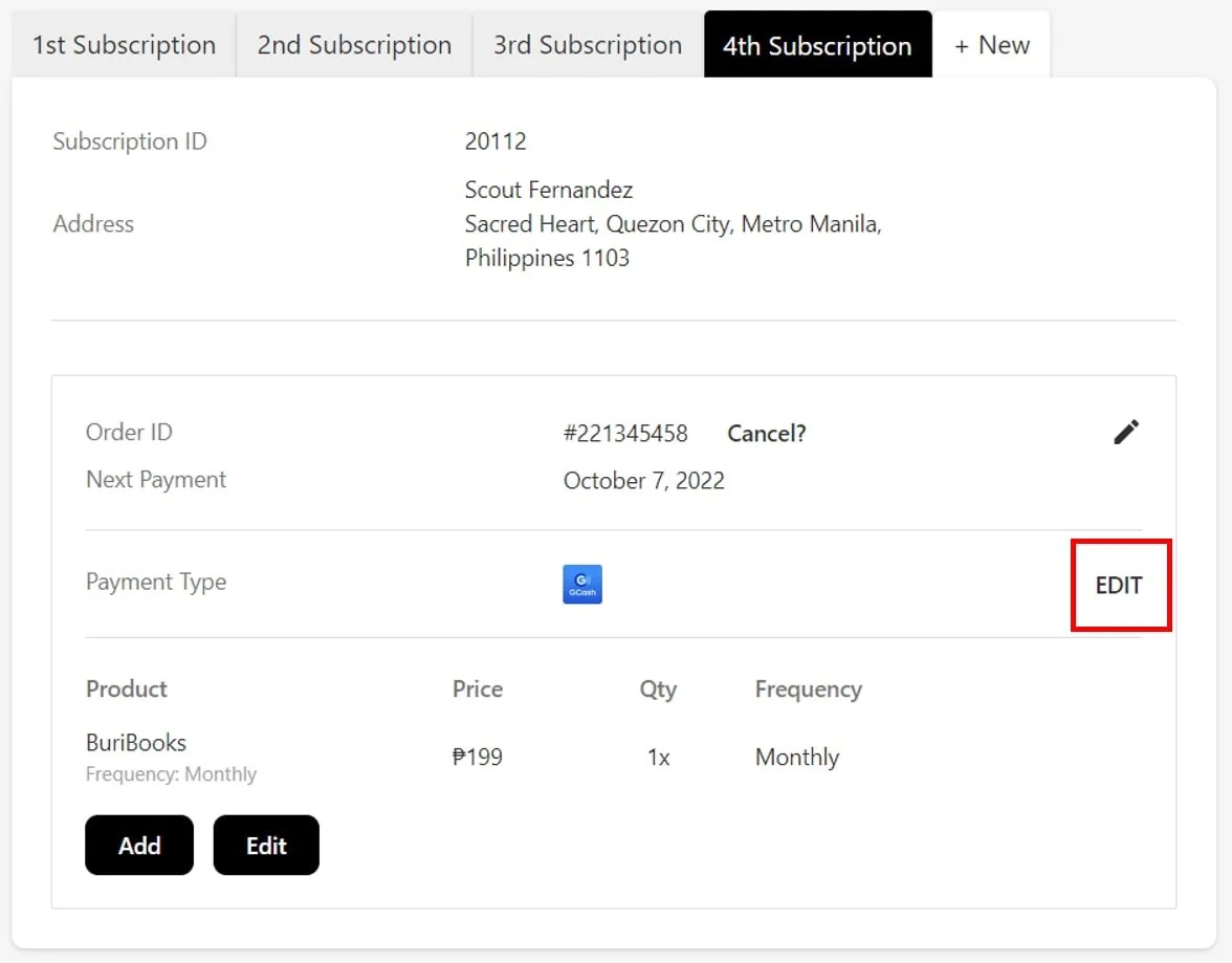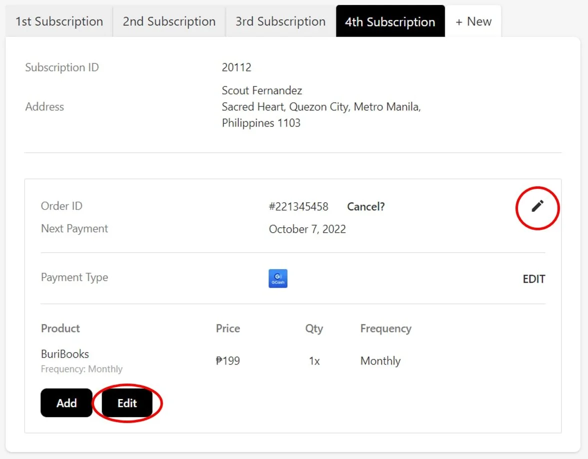 To change the frequency of payment for your subscription, you may click on the edit buttons either across Order ID or at the bottom of the subscription section.
