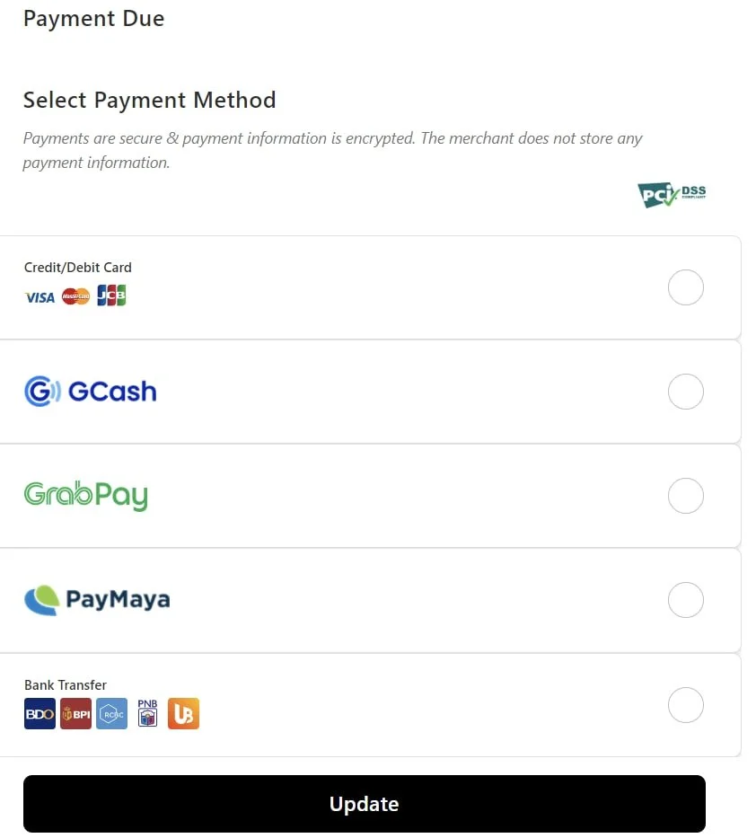Click on Update. Follow the instructions in setting the new payment method. You will be charged for your subscription using this new payment method in the indicated date in the Transaction Details section.
