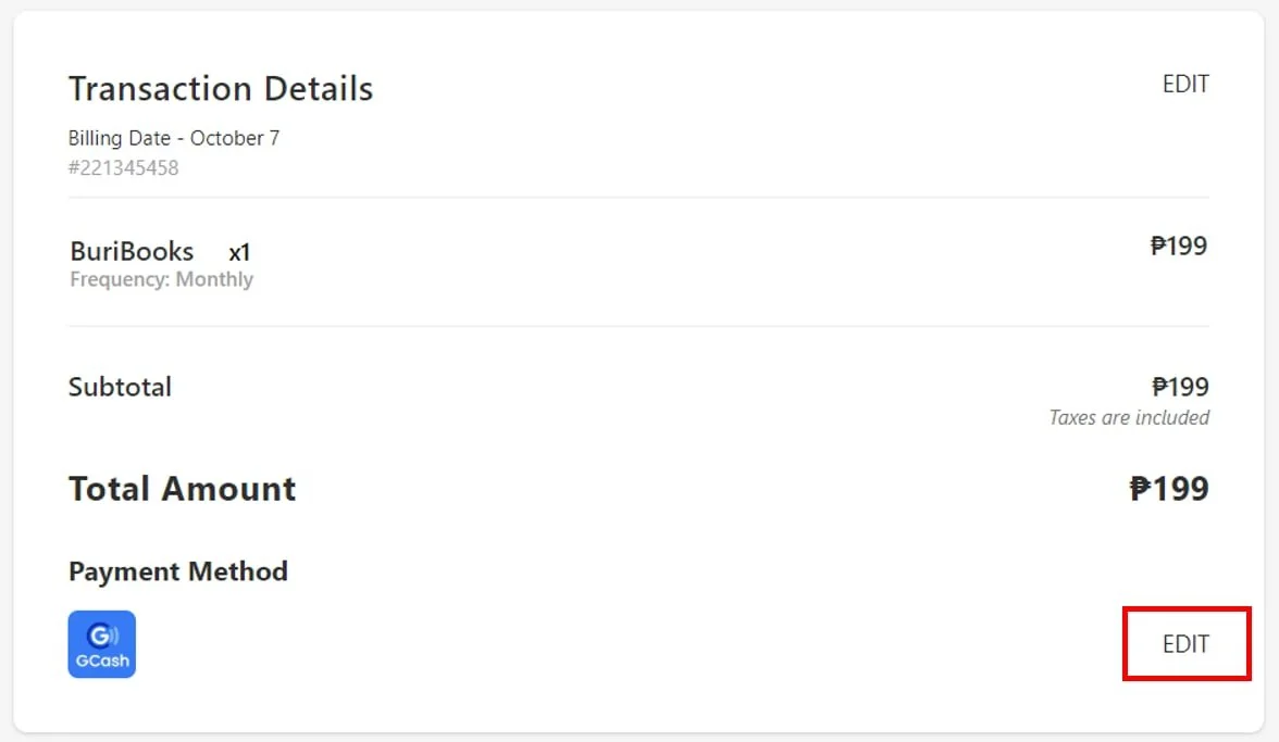 This will lead you to a new page for viewing the transaction. Click on Edit across the payment method you want to change.